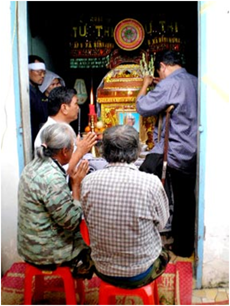 Sau đó tôi và anh Giáo vào chia buồn cùng gia đình người quá cố. Gian nhà chật hẹp, chỉ vừa đủ chỗ đặt cái quan tài ngay cửa ra vào và hai người đứng hai bên. Vợ anh Báu khóc nức nở, không thể nói lời cảm tạ. Tôi nói ngay: